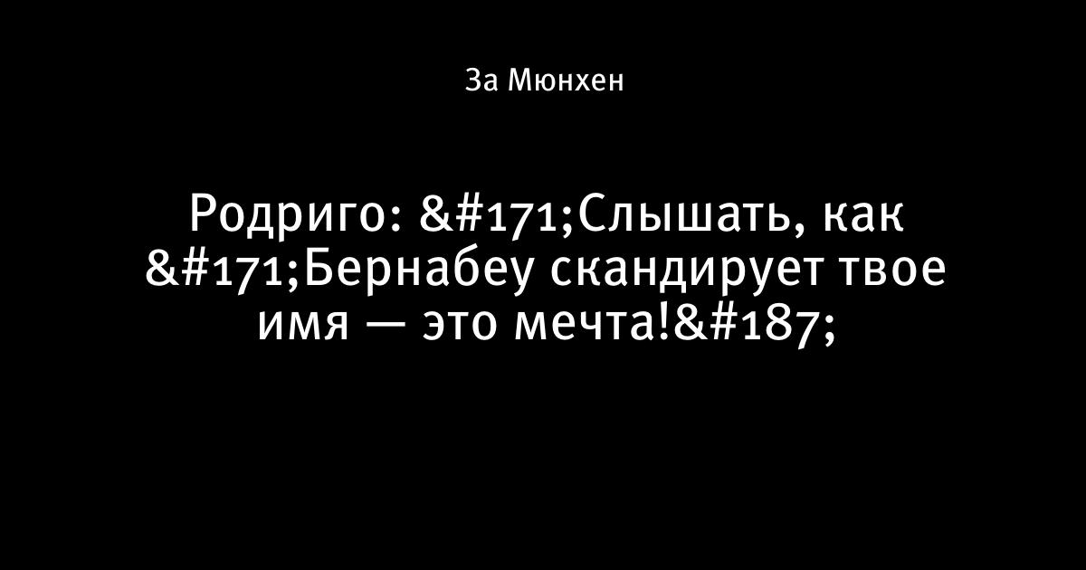 «Я очень счастлив и это правда, что все происходит гораздо быстрее, чем я рассчитывал, когда приехал сюда. Но я стараюсь быть спокойным и продолжать работать день за днем. Слышать, как «Бернабеу скандирует твое имя — это мечта! Я очень счастлив, это был очень счастливый вечер, но ты должен оставаться спокойным», — подытожил Родриго
