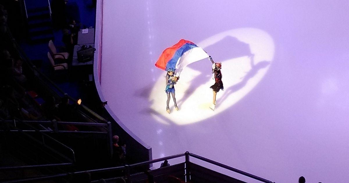 По телеку, как я уже говорил, всё в основном показывают крупным планом. А с трибуны можно кое-что и интересное заприметить. Сначала по программе были награждения, гимны и фотосессии спортсменов. В одной такой фотосессии Медведева и Трусова с флагом взяли под своё крыло Марайю Белл. Но российский паспорт вручить американке не успели, она сбежала. А вообще, было приятно, что Саша и Женя на награждении держались вместе. За флаг. Ну и, конечно, интересное фото получилось, когда Дмитрий Козловский из золотых медалей делал ушки своей партнёрше Александре Бойковой.