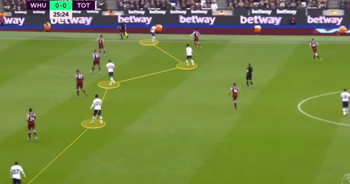 Впереди Алли и Сон связали двух центрбеков, которые никуда не могли деться со своих позиций, иначе оголили бы тылы по центру. Это означало, что "шпоры" могли находить пространство почти везде. Кейн опустился глубоко в центр, Лукас и Орье - широко на бровках. Отскочивший в свободную зону Кейн принял мяч и выдал типичный диагональный пас на Лукаса, отрезав всю среднюю линию "молотобойцев".
