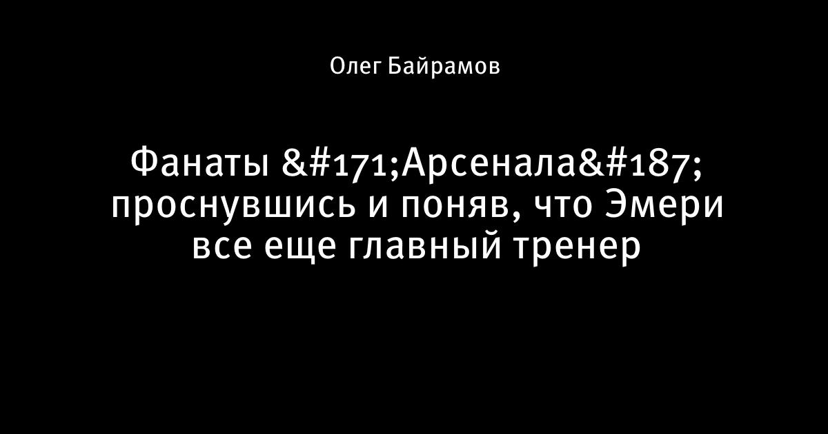 29 ноября 2019, 12:46 Фанаты «Арсенала» проснувшись и поняв, что Эмери все еще главный тренер Этот пост написан пользователем Sports.ru, начать писать может каждый болельщик (сделать это можно здесь). Автор Олег Байрамов