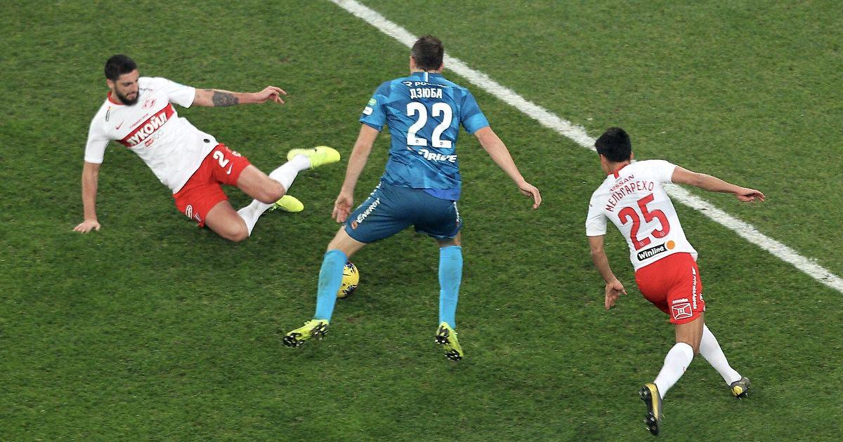 «Зенит» доминировал над «Спартаком» в первом тайме, больше атаковал, но забил один из голов классическим для эпохи Сергея Семака способом – навесом на Артема Дзюбу.