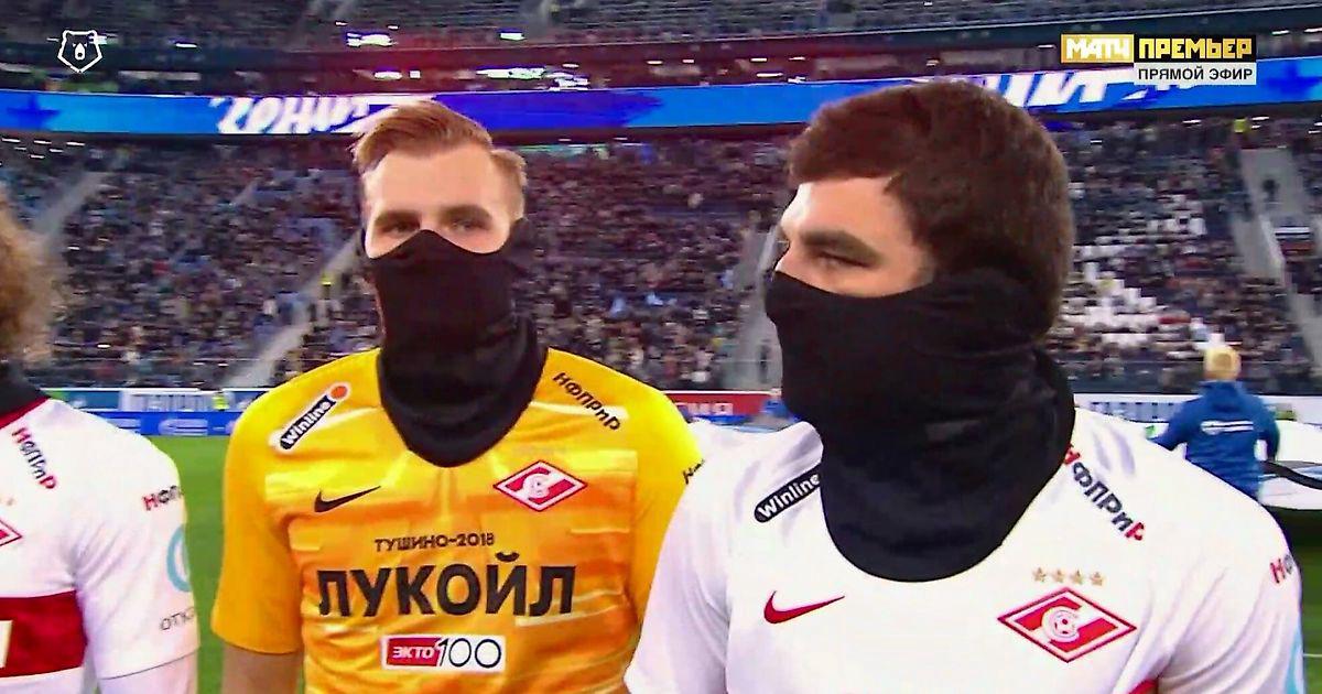 Перед приветствием Георгий Джикия проверил, чтобы все партнеры натянули снуды на лицо. Болельщики «Спартака» в соцсетях сразу посчитали, что это сделали в знак поддержки фанатов, которых петербургская полиция вместе с Центром «Э» задерживала перед игрой.