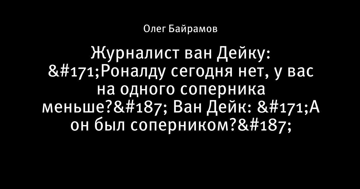 2 декабря 2019, 22:21 Журналист ван Дейку: «Роналду сегодня нет, у вас на одного соперника меньше?» Ван Дейк: «А он был соперником?» Этот пост написан пользователем Sports.ru, начать писать может каждый болельщик (сделать это можно здесь). Автор Олег Байрамов