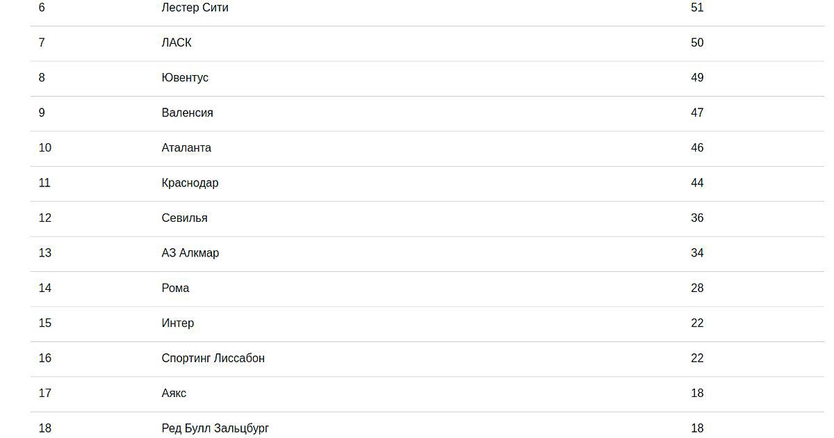 Первую пятёрку рейтинга по прежнему удерживают Ливерпуль, Манчестер Сити, Барселона, Аякс и Бавария. Зенит благодаря победе над Лионом и теперь опережает Тоттенхем, Атлетико и Лестер, что выглядит довольно забавно.