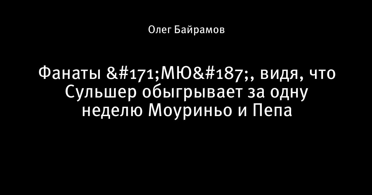 7 декабря 2019, 21:34 Фанаты «МЮ», видя, что Сульшер обыгрывает за одну неделю Моуриньо и Пепа Этот пост написан пользователем Sports.ru, начать писать может каждый болельщик (сделать это можно здесь). Автор Олег Байрамов