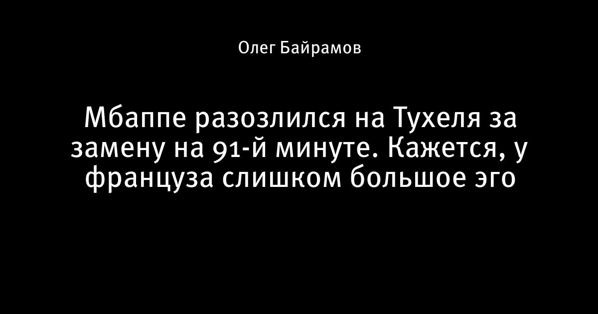 7 декабря 2019, 21:48 Мбаппе разозлился на Тухеля за замену на 91-й минуте. Кажется, у француза слишком большое эго Этот пост написан пользователем Sports.ru, начать писать может каждый болельщик (сделать это можно здесь). Автор Олег Байрамов