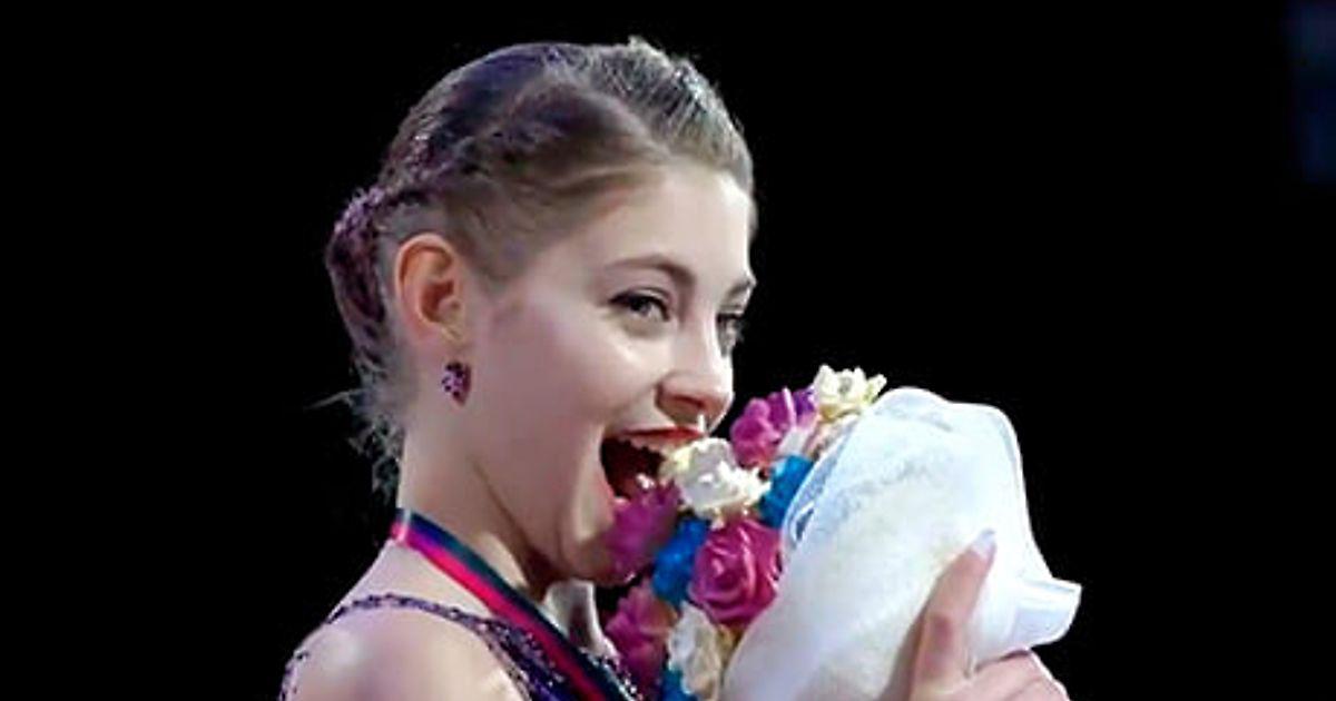 Миниатюрная Анна Щербакова, которая выиграла сегодня произвольную программу, уже на медальной церемонии... чуть не упала. Эпизод на видео Первого канала смотрите с 2:10.