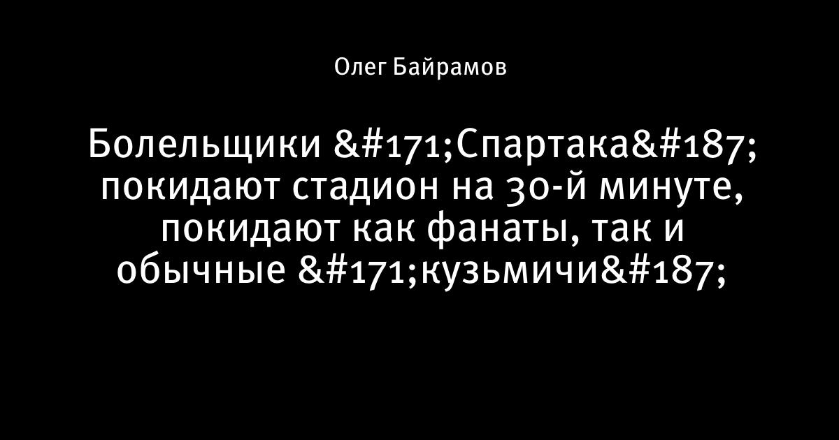 8 декабря 2019, 19:54 Болельщики «Спартака» покидают стадион на 30-й минуте, покидают как фанаты, так и обычные «кузьмичи» Этот пост написан пользователем Sports.ru, начать писать может каждый болельщик (сделать это можно здесь). Автор Олег Байрамов