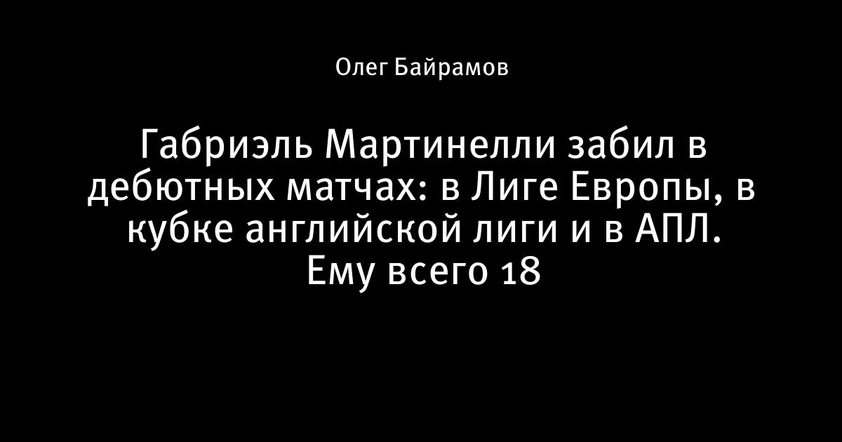 10 декабря 2019, 00:45 Габриэль Мартинелли забил в дебютных матчах: в Лиге Европы, в кубке английской лиги и в АПЛ. Ему всего 18 Этот пост написан пользователем Sports.ru, начать писать может каждый болельщик (сделать это можно здесь). Автор Олег Байрамов