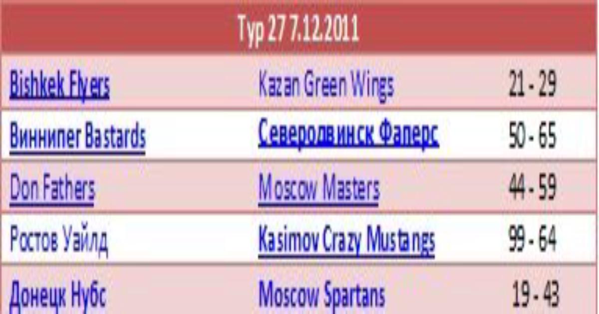 Северодвинск Фаперс в очередной раз обыграли Виннипег Bastards,а Kazan Green Wings снова повезло. Жалкие 29 очков принесли казанцам победу над Bishkek Flyers.