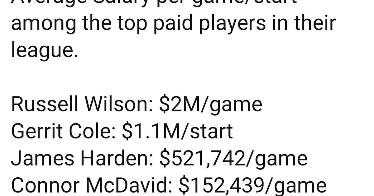 Самая большая ЗП в пересчете на один матч у квотербека клуба по американскому футболу (NFL) "Сиетл Сихокс " Рассела Уилсона , который получает в среднем 2 млн.$ за каждый матч проведенный в составе. На втором месте идет питчер бейсбольного клуба "Нью-Йорк Янкиз" Геррит Коул , недавно заключивший рекордный 9 летний контракт на сумму 324млн.$, в пересчете на игры он будет получать 1.1млн.$ за один матч. На 3 месте баскетболист клуба НБА "Хьюстон Рокетс" Джеймс Харден получающий в среднем 521 742$ за игру. Хоккей идет на 4 месте, где самая большая ЗП у нападающего клуба "Эдмонтон Ойлерз" Конора МакДэвида , который получает 152 439$ за каждый выход на лед в НХЛ.