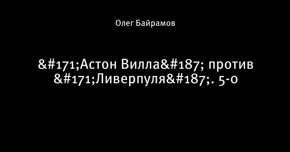 18 декабря 2019, 01:13 «Астон Вилла» против «Ливерпуля». 5-0 Этот пост написан пользователем Sports.ru, начать писать может каждый болельщик (сделать это можно здесь). Автор Олег Байрамов