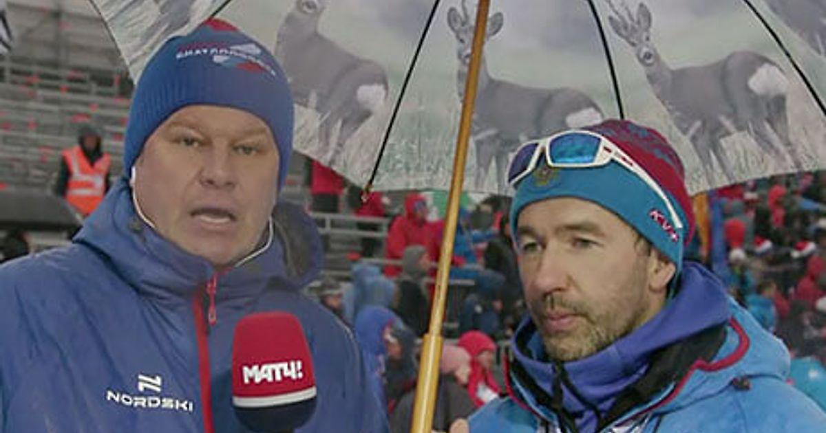 Дмитрий Губерниев выходил в эфир, держа в руке зонт с оленями. Иногда ему помогал тренер женской сборной Виталий Норицын.