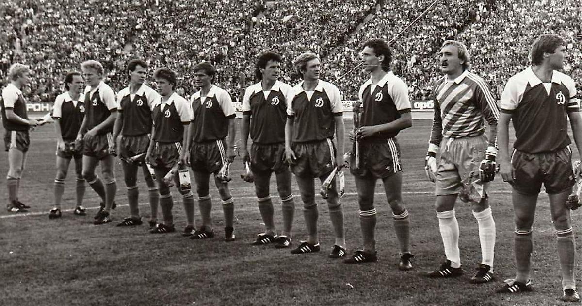 «Серебряные» призеры Евро-1988 из Киева 31 августа 1988 года перед матчем с «Зенитом». Вскоре им в торжественной обстановке ленинградцы вручат цветы. Слева направо: Алексей Михайличенко, Игорь Беланов, Олег Кузнецов, Геннадий Литовченко, Александр Заваров, Василий Рац, Андрей Баль (единственный не призер), Владимир Бессонов, Олег Протасов, Виктор Чанов, Анатолий Демьяненко