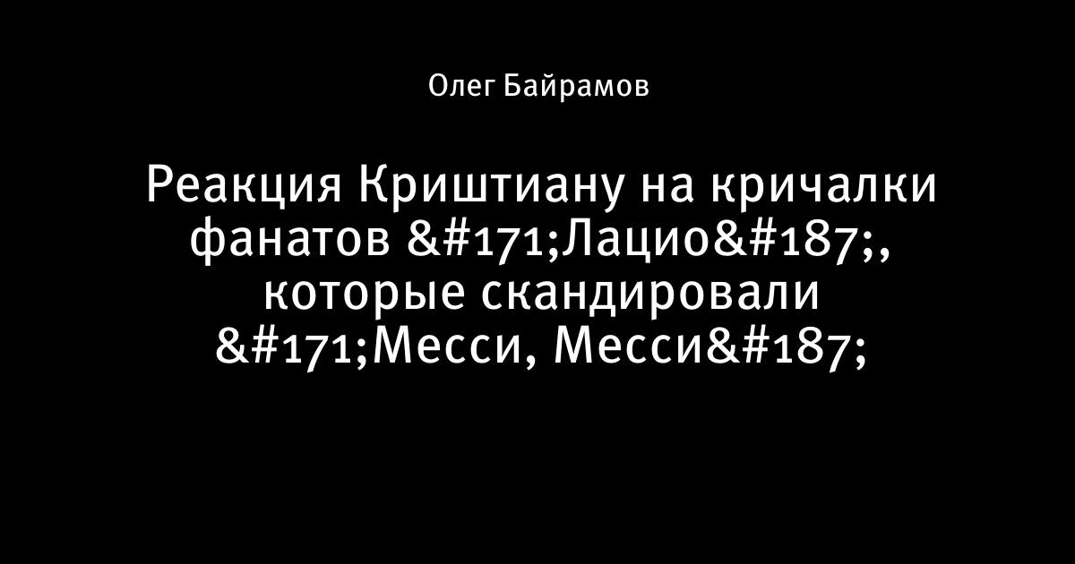 26 декабря 2019, 13:11 Реакция Криштиану на кричалки фанатов «Лацио», которые скандировали «Месси, Месси» Этот пост написан пользователем Sports.ru, начать писать может каждый болельщик (сделать это можно здесь). Автор Олег Байрамов