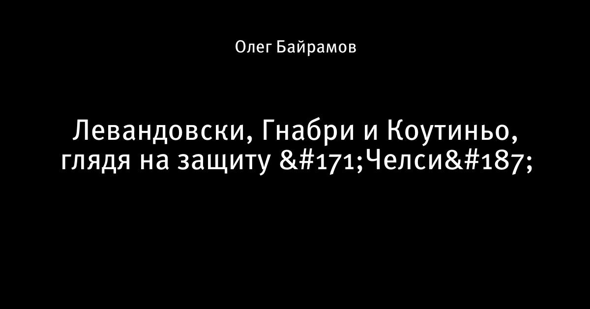 27 декабря 2019, 00:14 Левандовски, Гнабри и Коутиньо, глядя на защиту «Челси» Этот пост написан пользователем Sports.ru, начать писать может каждый болельщик (сделать это можно здесь). Автор Олег Байрамов