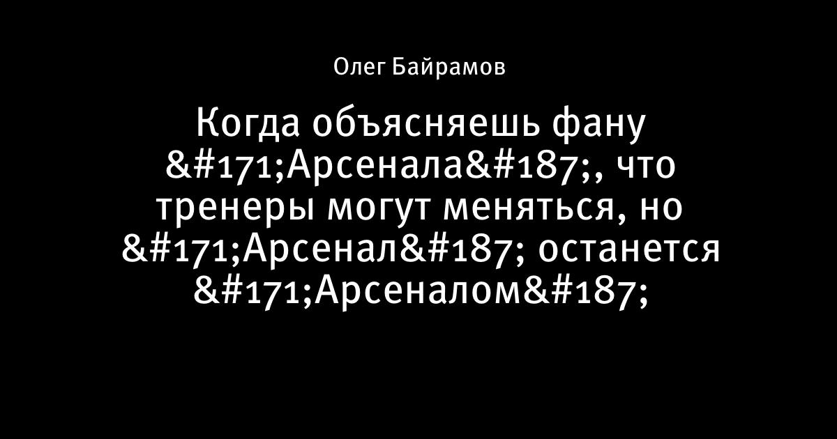 27 декабря 2019, 00:36 Когда объясняешь фану «Арсенала», что тренеры могут меняться, но «Арсенал» останется «Арсеналом» Этот пост написан пользователем Sports.ru, начать писать может каждый болельщик (сделать это можно здесь). Автор Олег Байрамов