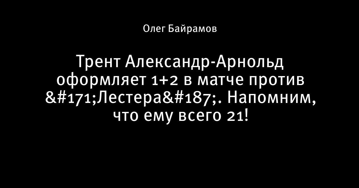 27 декабря 2019, 00:48 Трент Александр-Арнольд оформляет 1+2 в матче против «Лестера». Напомним, что ему всего 21! 🔥 Этот пост написан пользователем Sports.ru, начать писать может каждый болельщик (сделать это можно здесь). Автор Олег Байрамов