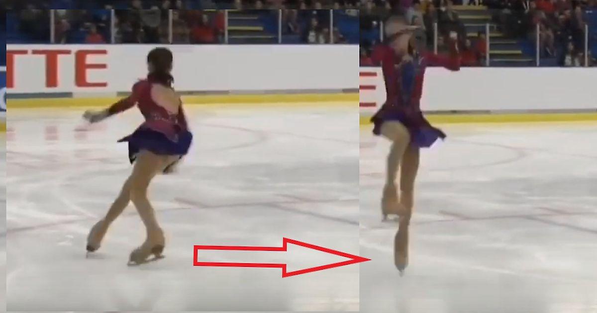 Типичный, формально читерский щербаковский тулупчик, который формально должен быть понижен на оборот. Была на внешнем ребре правого конька, перешла на зубцы, провернулась на них и прыгнула лицом вперёд: