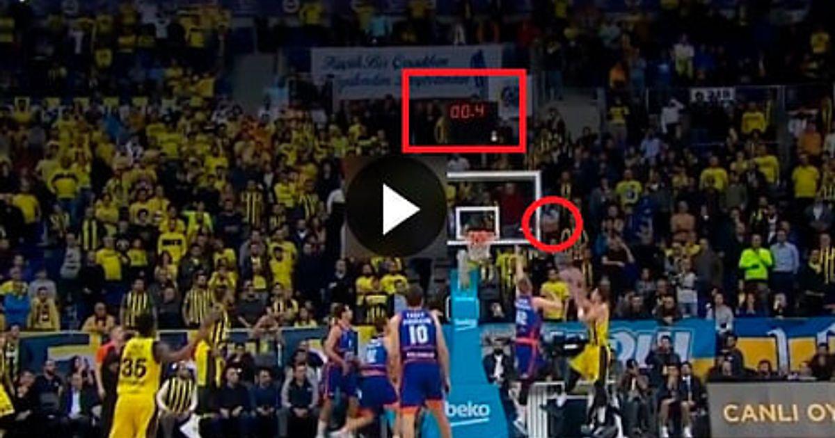 Ой, а что у нас за чудеса с секундомером в матче Фенера? За 0,4 секунды до конца 4 четверти Фенер проигрывает 82-84. Обрадович берет тайм-аут и Датоме вводит с чужой половины поля. Следите за мячом и за временем.