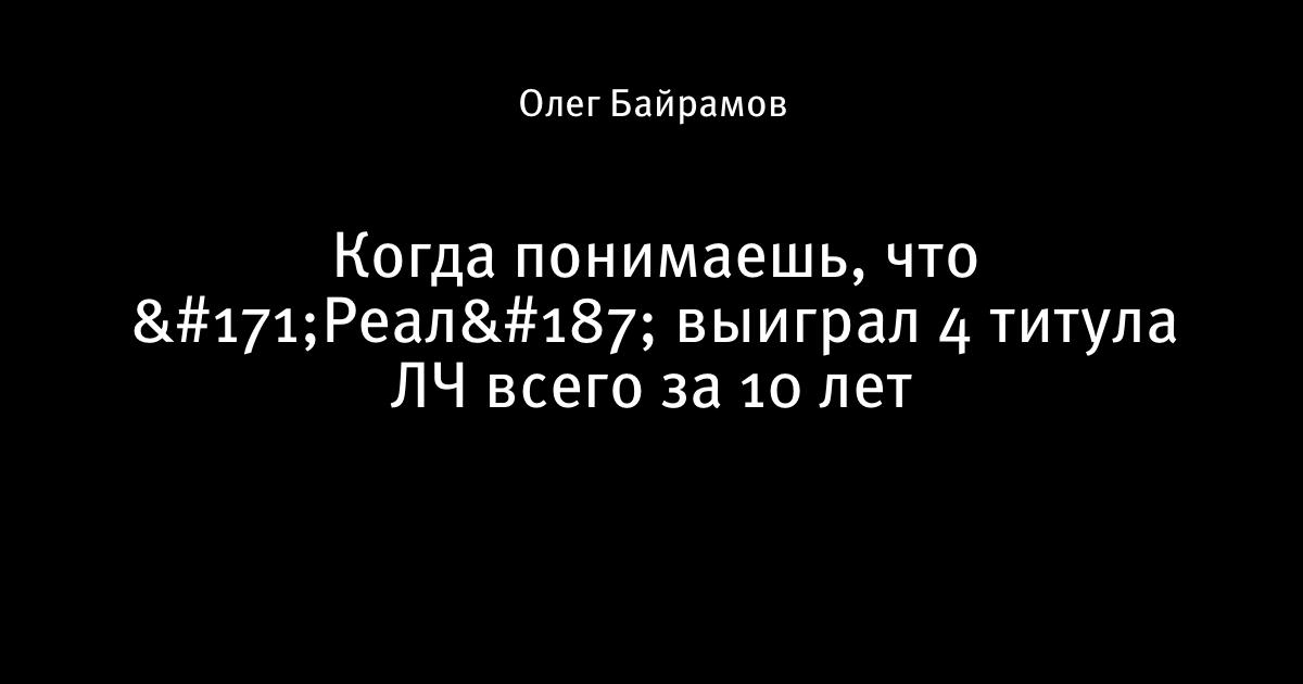 29 декабря 2019, 12:46 Когда понимаешь, что «Реал» выиграл 4 титула ЛЧ всего за 10 лет Этот пост написан пользователем Sports.ru, начать писать может каждый болельщик (сделать это можно здесь). Автор Олег Байрамов