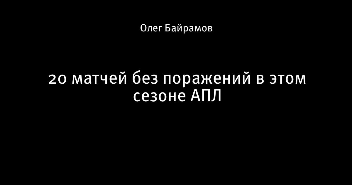 3 января 2020, 01:46 20 матчей без поражений в этом сезоне АПЛ Этот пост написан пользователем Sports.ru, начать писать может каждый болельщик (сделать это можно здесь). Автор Олег Байрамов