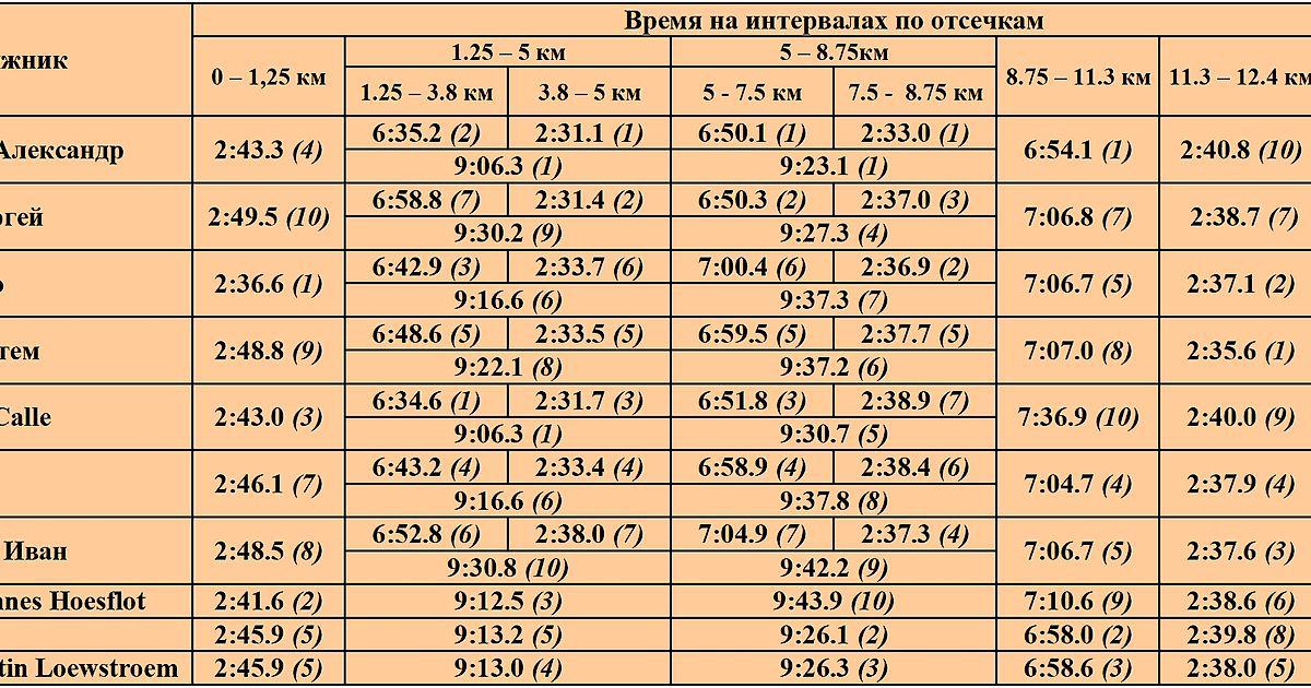 Всем привет, к сожалению, задержался с данной выкладкой. Ниже приведена таблица с сайта FIS по времени прохождения всей дистанции.