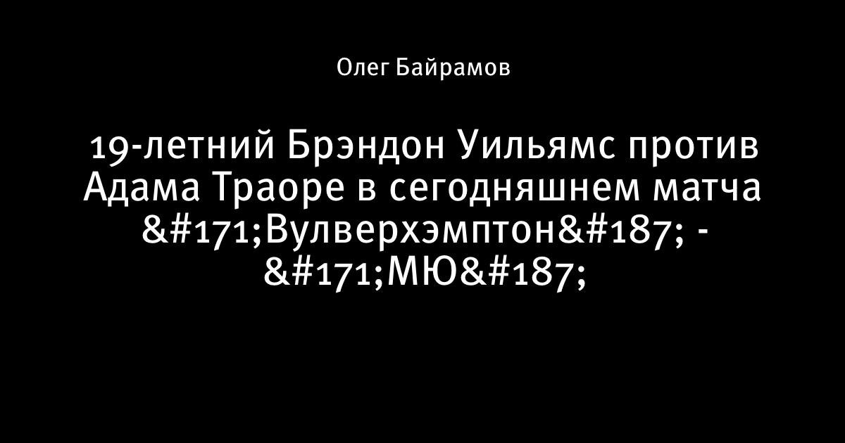 4 января 2020, 21:04 19-летний Брэндон Уильямс против Адама Траоре в сегодняшнем матча «Вулверхэмптон» - «МЮ» Этот пост написан пользователем Sports.ru, начать писать может каждый болельщик (сделать это можно здесь). Автор Олег Байрамов