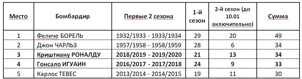 Следующий рекорд, который пытается покорить Роналду, – это рекорд скорострельности в серии А для ювентини. Только 10 игроков «Ювентуса» в своих первых двух сезонах в сумме забили больше чем звёздный португалец. Однако нынешний сезон ещё не закончен, и Роналду сможет увеличить свой бомбардирский багаж. Для объективности приведём список лучших бомбардиров «Ювентуса» в серии А по состоянию на 10 января второго для себя сезона. И в этом реестре CR7 второй: