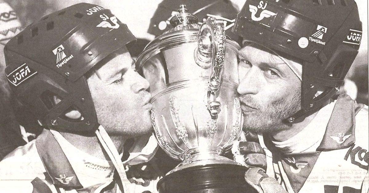 5 февраля 1995. Миннеаполис (США), стадион «Джон Роуз Овал». Лидеры сборной Швеции Юнас Клаессон (слева) и Ханс Юханссон с кубком победителя XIX чемпионата мира