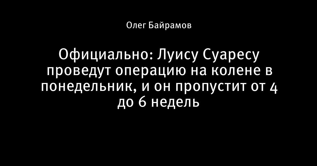 11 января 2020, 17:19 Официально: Луису Суаресу проведут операцию на колене в понедельник, и он пропустит от 4 до 6 недель 🤕 Этот пост написан пользователем Sports.ru, начать писать может каждый болельщик (сделать это можно здесь). Автор Олег Байрамов