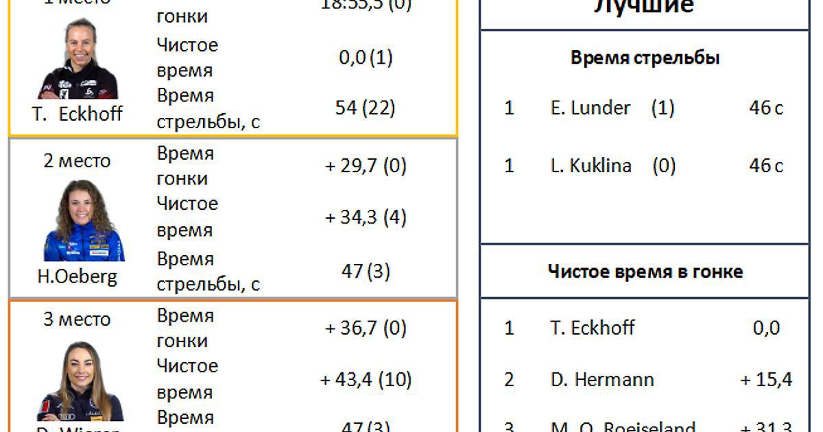 Провальная гонка получилась для наших биатлонисток, из плюсов стоит отметить только быструю и точную стрельбу Куклиной, ходом же отставания очень большие, самая быстрая из наших К. Резцова с отставанием более 1,5 минут.