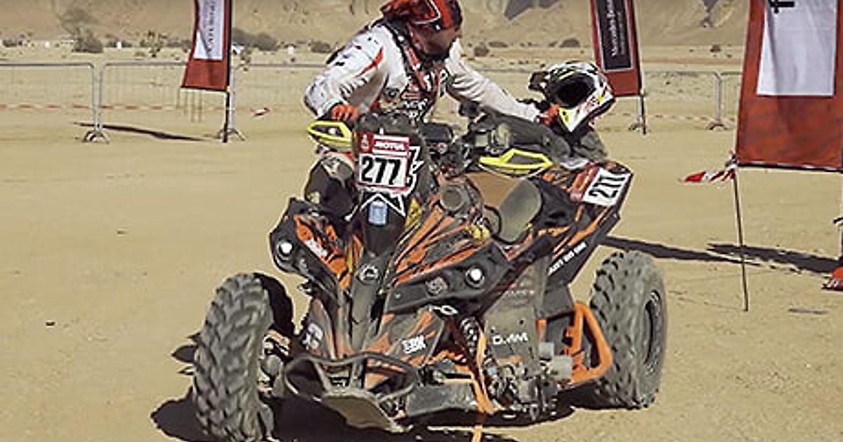 Эпичный финиш квадроциклиста на «Дакаре»: сломал одно из колес, но выиграл. И приехал на подиум на трех