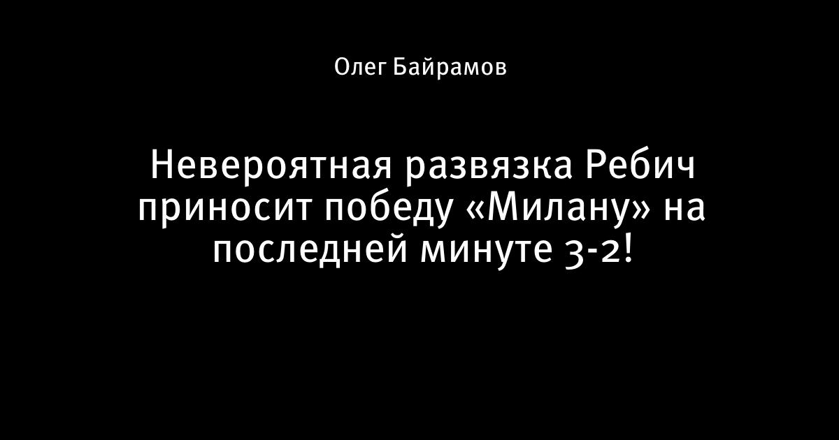 19 января 2020, 16:57 Невероятная развязка 😱 Ребич приносит победу «Милану» на последней минуте 🙌 3-2! Этот пост написан пользователем Sports.ru, начать писать может каждый болельщик (сделать это можно здесь). Автор Олег Байрамов