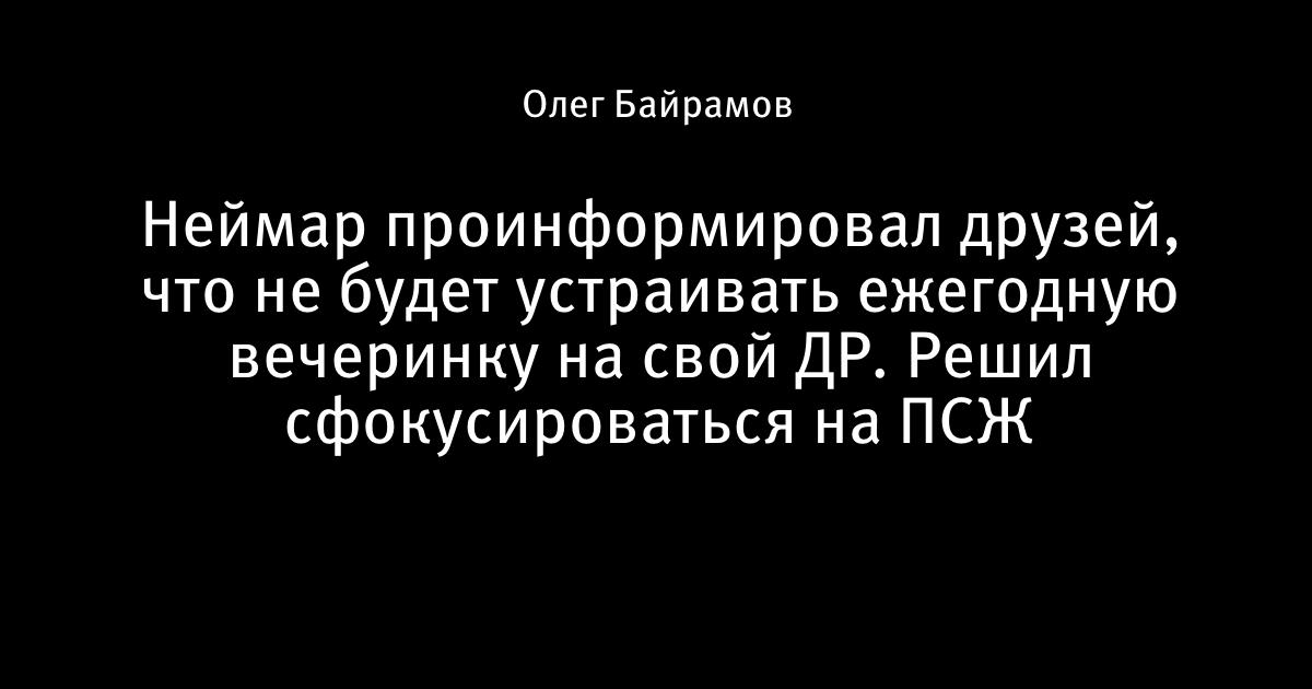 24 января 2020, 17:39 Неймар проинформировал друзей, что не будет устраивать ежегодную вечеринку на свой ДР. Решил сфокусироваться на ПСЖ 👀 Этот пост написан пользователем Sports.ru, начать писать может каждый болельщик (сделать это можно здесь). Автор Олег Байрамов