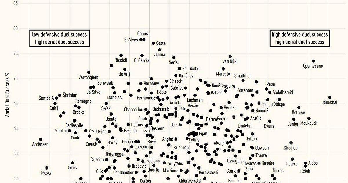 Cтатистика центральных защитников Европы по проценту выигранных единоборств в обороне