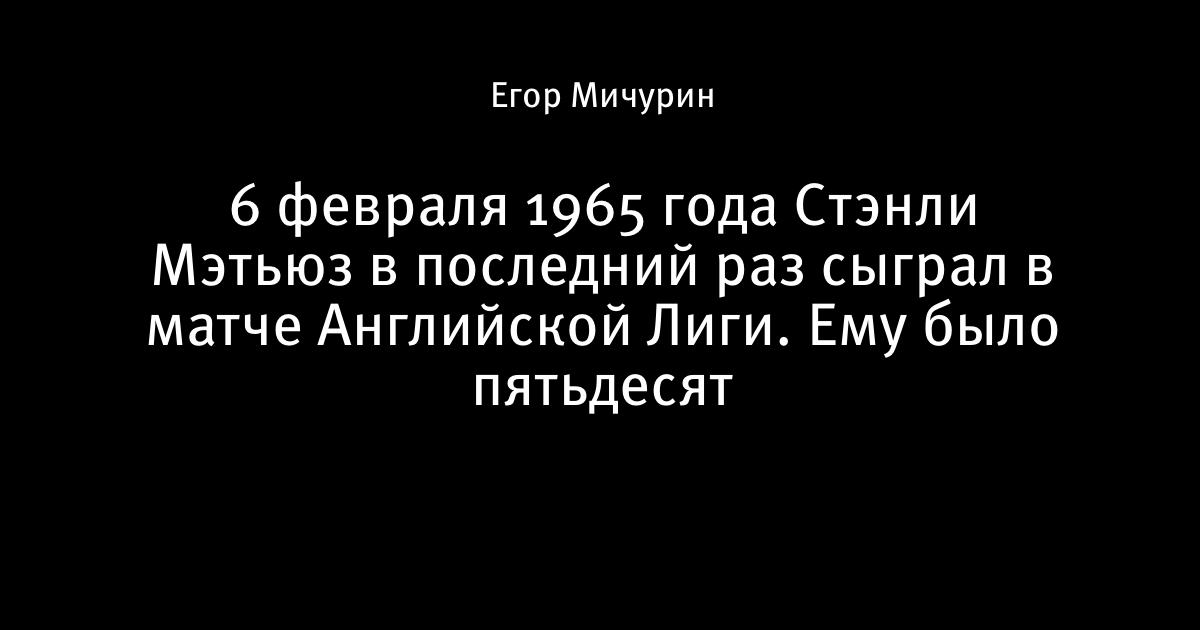6 февраля 1965 года Стэнли Мэтьюз в последний раз сыграл в матче Английской Лиги. Ему было пятьдесят