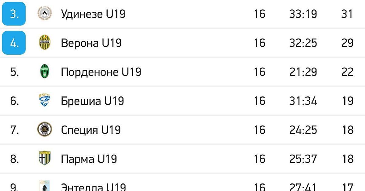 Турнирное положение команд молодежного первенства Чемпионата Италии U19 (Примавера 2 Группа А) после 16-го тура.