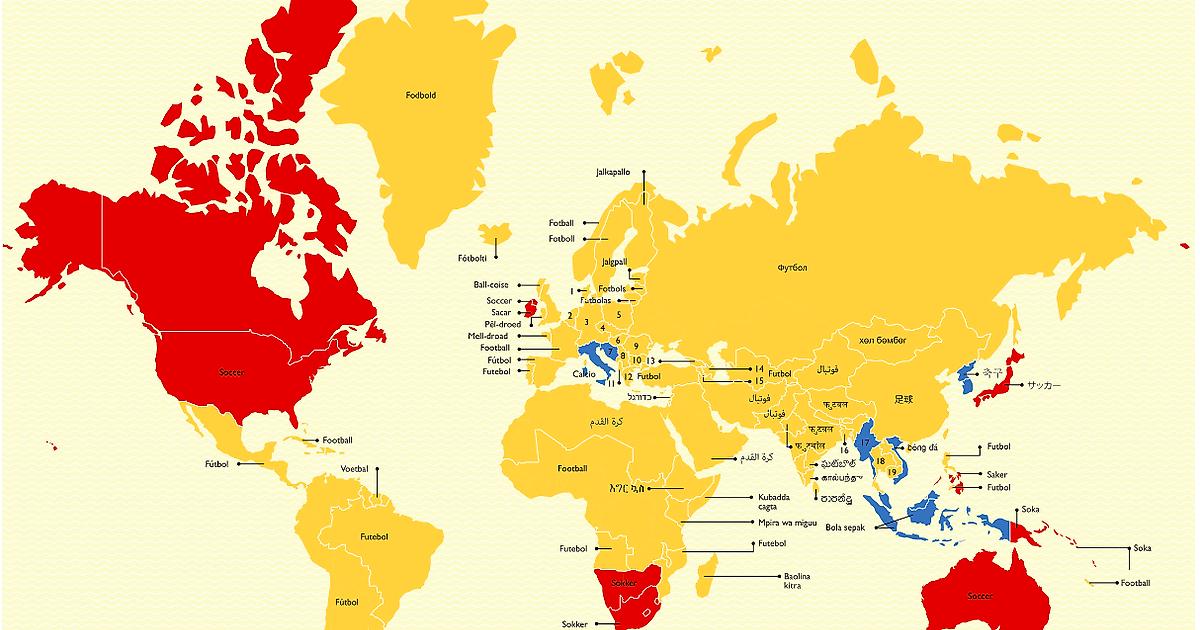 1. Fodbold 2. Voetbal 3. Fußball 4. Fotbal 5. Piłka nożna 6. Labdarúgás 7. Nogomet 8. Фудбал 9. Fotbal 10. Футбол 11. Futboll 12. Ποδόσφαιρο = Подосферо13. ფეხბურთი = Пехбурти 14. Futbol 15. ֆուտբոլ 16. ফুটবল 17. ဘောလုံး 18. ฟุตบอล 19. បាល់ទាត់"
