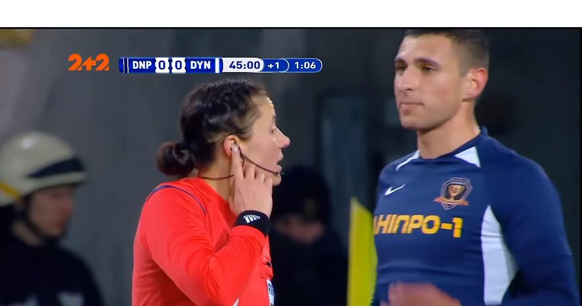 Судья Екатерина Монзуль (к слову, вся полевая бригада судей на этом матче была исключительно женская) предупреждает динамовца об опасной игре и матч продолжается. Но тут ей говорят посмотреть видеоповтор.