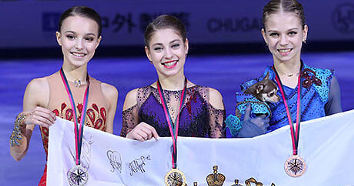 Женщины: Алена Косторная, Анна Щербакова, Александра Трусова.