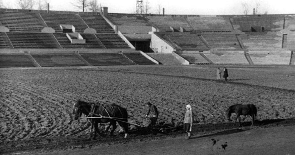 Подготовка футбольного поля московского стадиона «Динамо» к сезону после реконструкции в 1935 году
