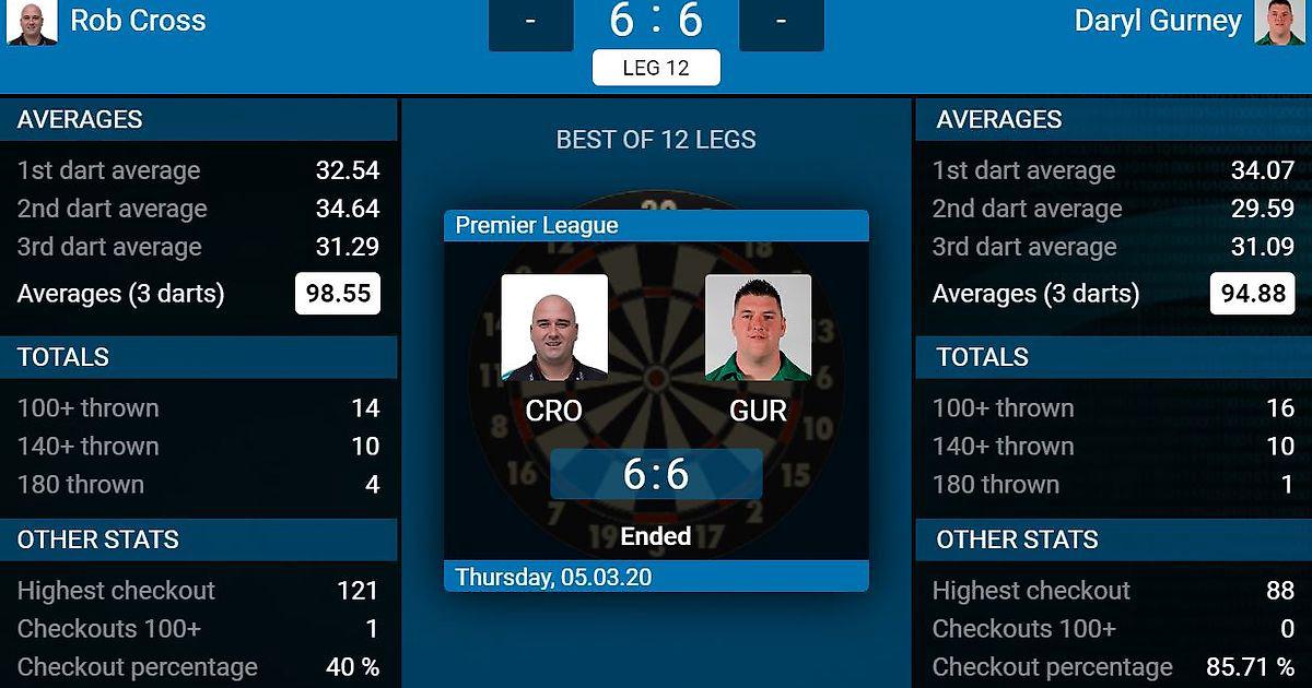 На матч, а сплошные качели. Сначала первые три лега взял Герни, потом Роб ответил четырьмя. Вообщем ничья - закономерный результат. Правда обоим дартсменам это сильно не помогло, теперь они оба находятся в подвале турнирной таблицы.