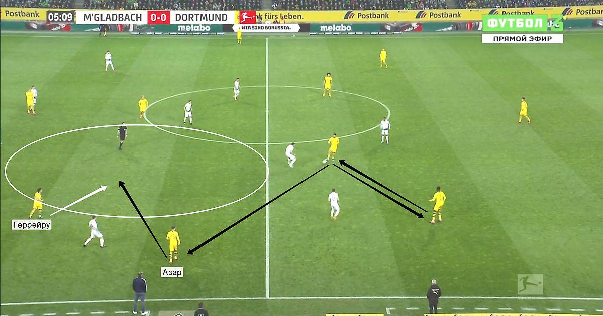 По ходу матча таких ситуаций стало возникать все меньше, но от Крамера таких действий стоило ожидать и далее. Он мог покинуть свою зону, куда открывались Азар, Геррейру и реже Брандт. В таких ситуациях Лайнер оставался 2в1.