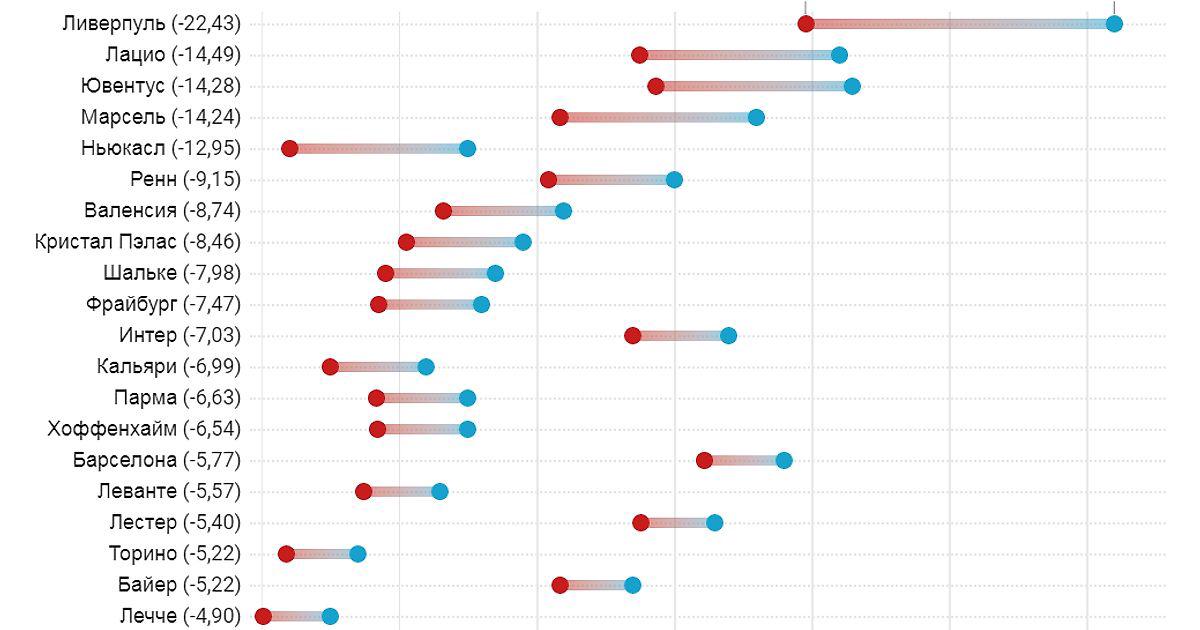 «Ливерпуль» лидирует среди 20 команд с наибольшим перебором очков в сезоне 2019/20. «Лацио» и «Юве» — в тройке