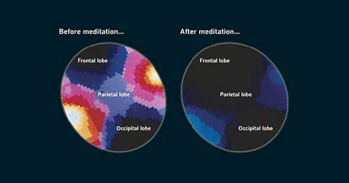 К статье приложено изображение, показывающее, что происходит в мозге во время медитации. Бета-волны, свидетельствующие о том, что головной мозг занимается обработкой информации, уменьшаются во время медитации и после.