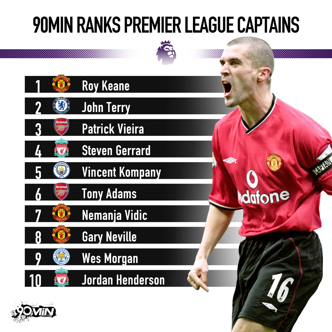 90 min представляет свой топ-10 лучших кэпов в истории АПЛ. Возглавляет список легенда «МЮ» — Рой Кин. Замыкает десятку — Джордан Хендерсон — нынешний лидер «Ливерпуля».