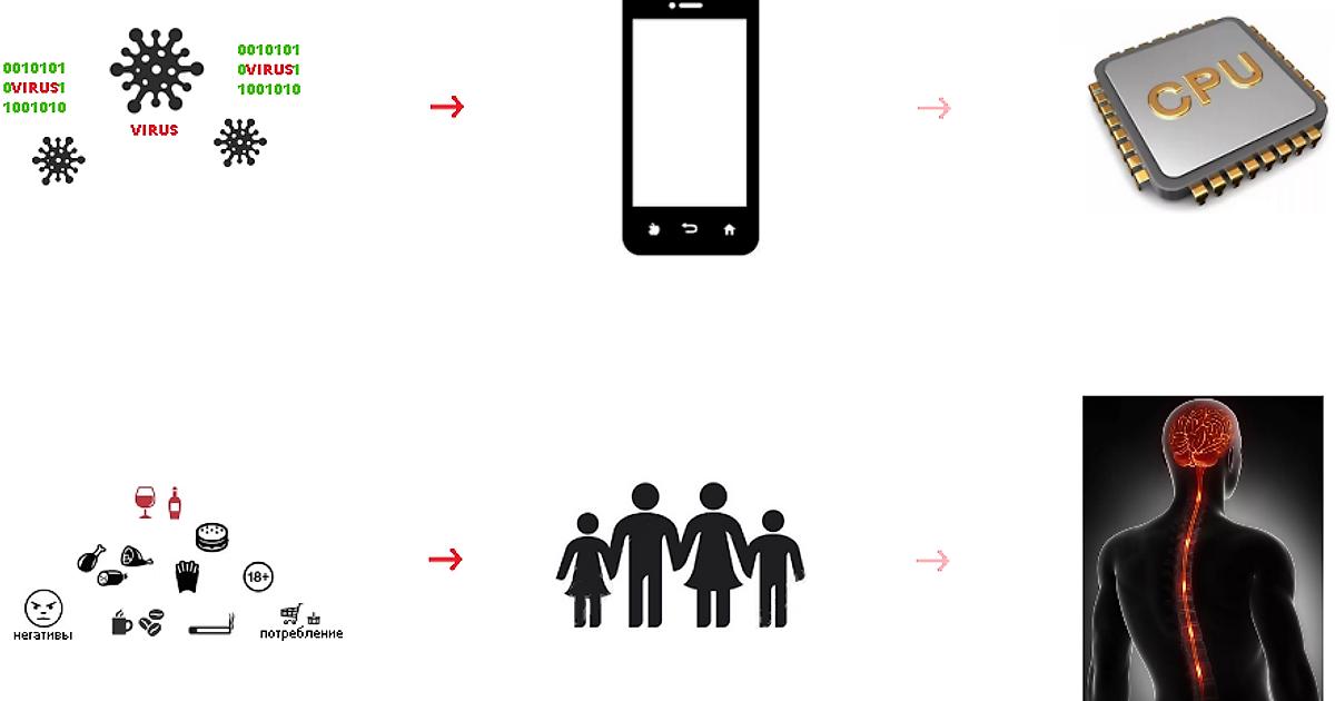 А что если не просто заблокированный/запароленный смартфон, а заражённый вирусами? и что такие явления в обществе как падкость на различные удовольствия, пороки, искушения, зависимости - это не что иное как вирусы? Аналогия довольна схожа. Цифровые вирусы атакующие смартфон и постепенно превращающие его в кирпич, и вирусы-пороки атакующие человека, и при его лени, бездействии, нежелании напрягаться и развиваться, превращающие его в обезьяну.