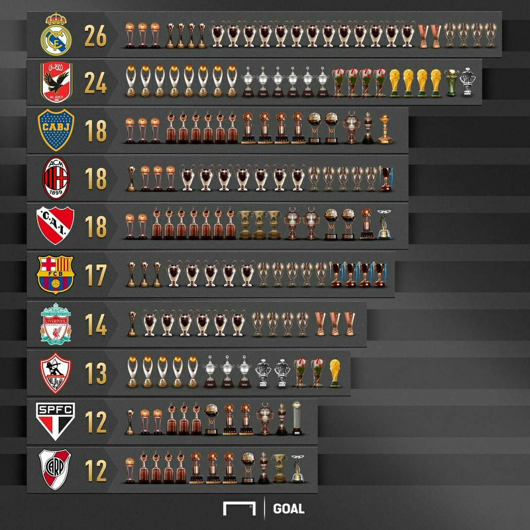 Портал Goal представил топ-10 самых титулованных клубов на международном уровне. Первое место с 26 трофеями занял мадридский «Реал».