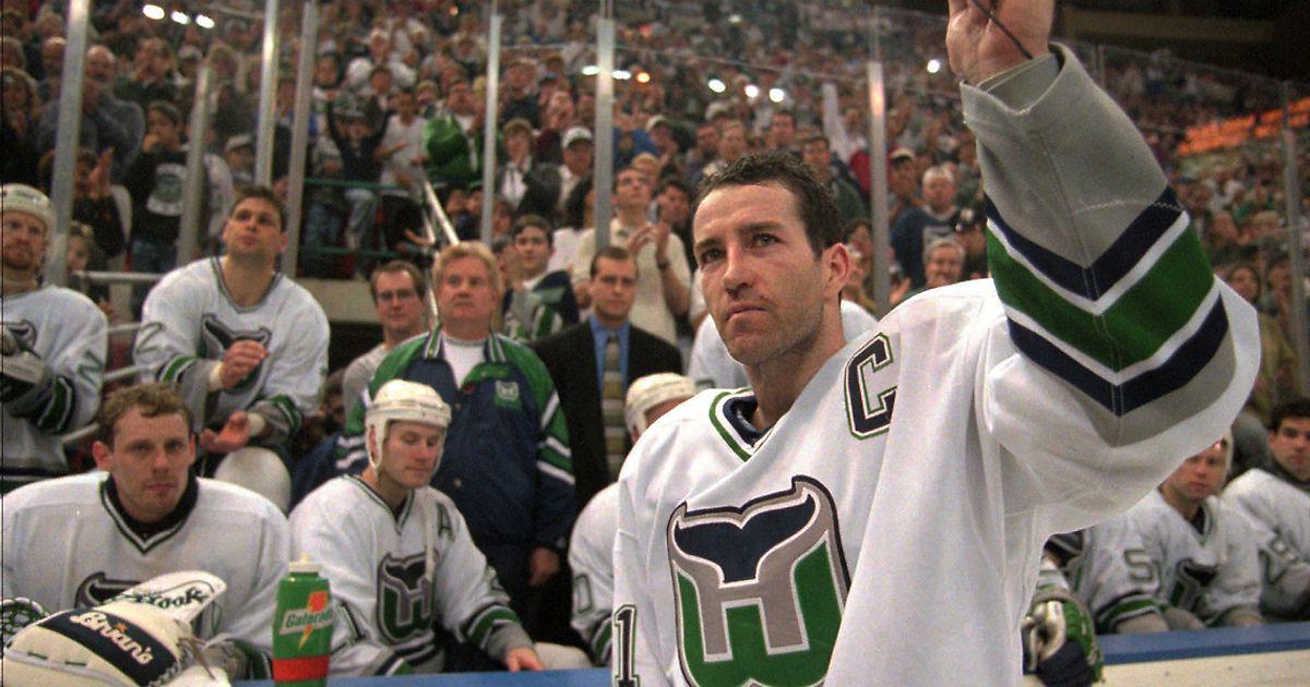 Капитан «Хартфорд Уэйлерс» Кевин Дайнин прощается с болельщиками в воскресенье, 13 апреля 1997-го, после своего краткого обращения к ним. «Уэйлерс» победили «Тампу-Бэй Лайтнинг» и прекратили свое существование в Хартфорде